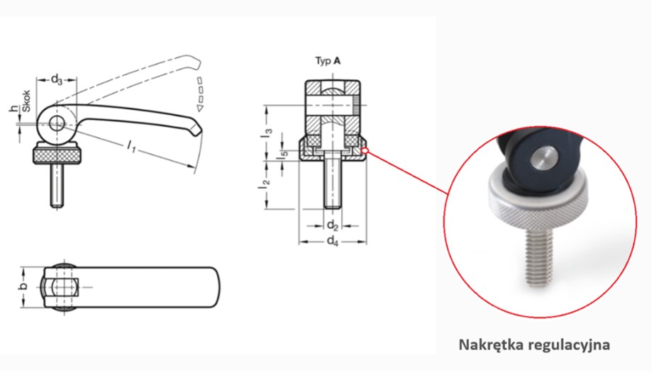 Za pomocą gwintu drobnozwojnego możemy dokładnie wyregulować odległość l4 pomiędzy powierzchnią oporową a krzywką dźwigni. Taka regulacja daje możliwość ustalenia odpowiedniej siły zacisku oraz odpowiedniego położenia dźwigni.
