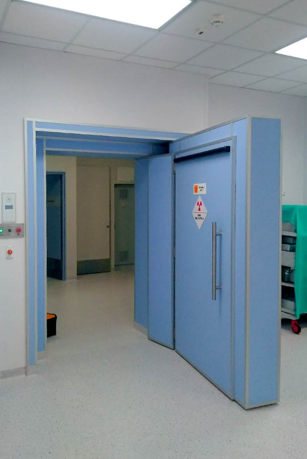 Drzwi do ochrony radiologicznej są zbudowane ze stalowej ościeżnicy oraz skrzydła wypełnionego materiałem ochronnym. Są projektowane do konkretnej aplikacji lub potrzeby klienta. Ze względu na to, że drzwi posiadają dużą wagę (dochodzącą nawet do 12 t) zostały w pełni zautomatyzowane. Za napęd drzwi jest odpowiedzialny silnik serwo z przekładnią planetarną połączony z zawiasem dolnym. Rozwiązanie to pozwala na otwieranie/zamykanie drzwi w czasie poniżej 10 s.