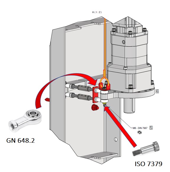Silnik wraz z ramieniem reakcyjnym zamontowano do ościeżnicy za pomocą dwóch cięgien, zakończonych przegubami kulistymiGN 648.2. Przeguby z ramieniem reakcyjnym zostały połączone przy pomocy śruby pasowanejISO 7379[Rys. 3].