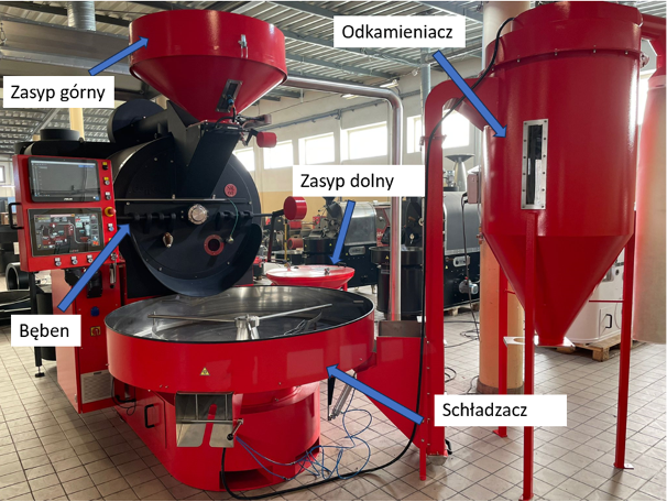 Standardowa linia do palenia kawy (Rys. 2) składa się m.in. z zasypu dolnego, gdzie zasypywane są zielone ziarna kawy. Z tego miejsca przy pomocy dmuchawy oraz ciągu rur, kawa jest transportowana do zasypu górnego. Po rozgrzaniu pieca z zasypu górnego, trafia do bębna, w którym następuje proces palenia (prażenia) kawy. W trakcie tego procesu powstają spaliny, które przy pomocy urządzenia zwanego cyklonem zostają oczyszczone z łusek kawy. Łuski trafiają do specjalnych wiader pod cyklonem. Cały proces prażenia kawy jest automatycznie regulowany przy pomocy sterownika PLC z panelem HMI, dzięki czemu można dostosować parametry do uzyskania odpowiednich właściwości lub aromatu kawy. Następnie ziarna trafiają na schładzacz. Specjalne łopatki mieszają kawę dla równomiernego schłodzenia, po czym trafia ona do odkamieniacza, który odpowiada za usuwanie niechcianych zanieczyszczeń takich jak: drobne kamienie lub opiłki metali.