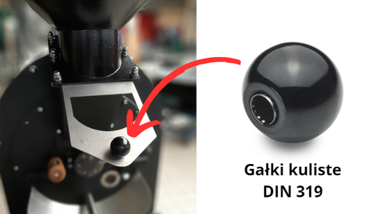 Gałki kuliste DIN 319 (Rys. 8) służą jako pochwyt w zasuwie pomiędzy zasypem górnym a bębnem pieca (Rys. 9). Po wsunięciu zasuwy, następuje wsypanie ziarna kawy z zasypu do bębna.