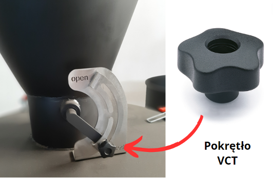 Pokrętła serii VCT. są wykonane z wysoce udarowego technopolimeru na bazie polipropoylenu (PP). Zostały wykorzystane w cyklonie i służą do blokady dźwigni klapki zsypu. Ciekawą zaletą tych pokręteł jest wybór koloru zaślepki (siedem kolorów), dzięki czemu można dostosować go pod barwy firmowe klienta czy wykorzystać w praktyczny sposób np. do identyfikacji wykonywanej czynności.