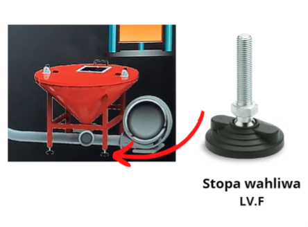 Zasyp dolny linii do palenia kawy został wyposażony w stopy wahliwe LV.F (Rys. 3) z podkładką antypoślizgową oraz możliwością kotwienia do podłoża. Do otwieranej pokrywy zasypu wykorzystano zawiasy CFA oraz uchwyt M.643 (Rys. 4).