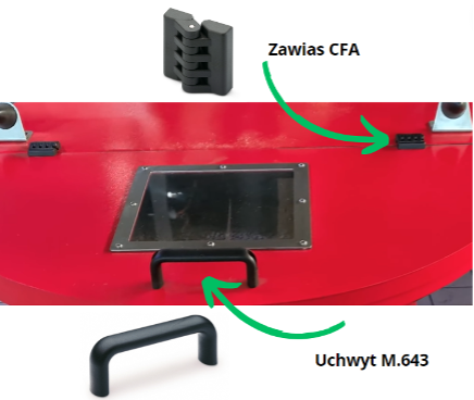 Rys. 4 Zawiasy CFA i uchwyt M.643 w pokrywie zasypu dolnego