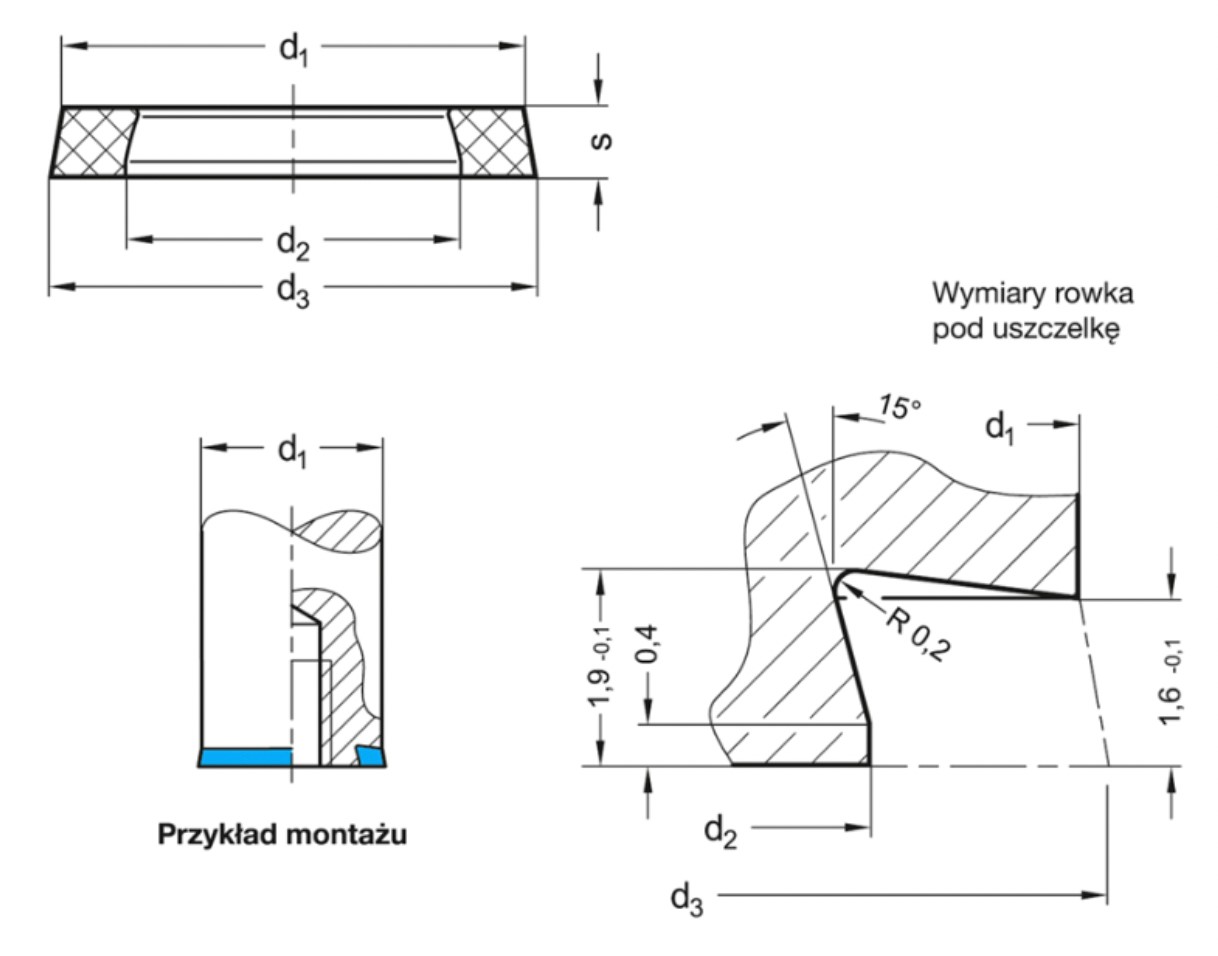Rys. 2: Kształt uszczelki stosowanej w śrubach/nakrętkach GN 1580 oraz rowka do jej osadzenia.