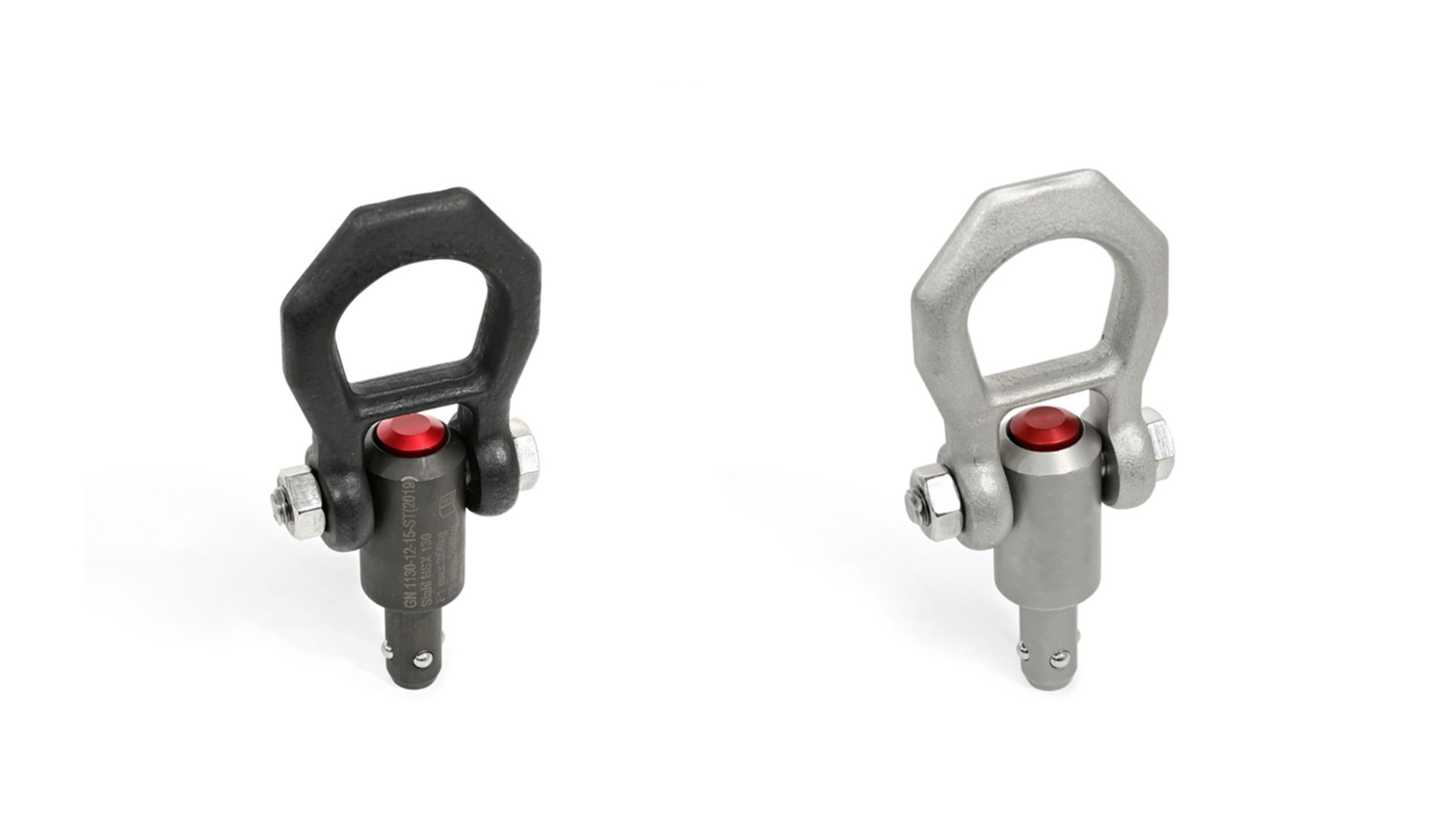 Trzpienie transportowe GN 1130 są przeznaczone do szybkiego i prostego zawieszania ciężkich elementów maszyn oraz narzędzi. Po naciśnięciu czerwonego przycisku w główce trzpienia, sprężyna zwalnia kulki, umożliwiając wsunięcie trzpienia do odpowiednio przygotowanego gniazda. Po zwolnieniu przycisku, kulki wypychają trzpień, blokując go i mocując w gnieździe. Dzięki temu trzpień może obracać się o pełne 360°, natomiast pętla może obracać się względem osi mocowania (odchylać na boki) w zakresie 180°. Dodatkowa poprzeczka w pętli osłania przycisk zwalniający, co dodatkowo zapobiega przypadkowemu wypięciu trzpienia.