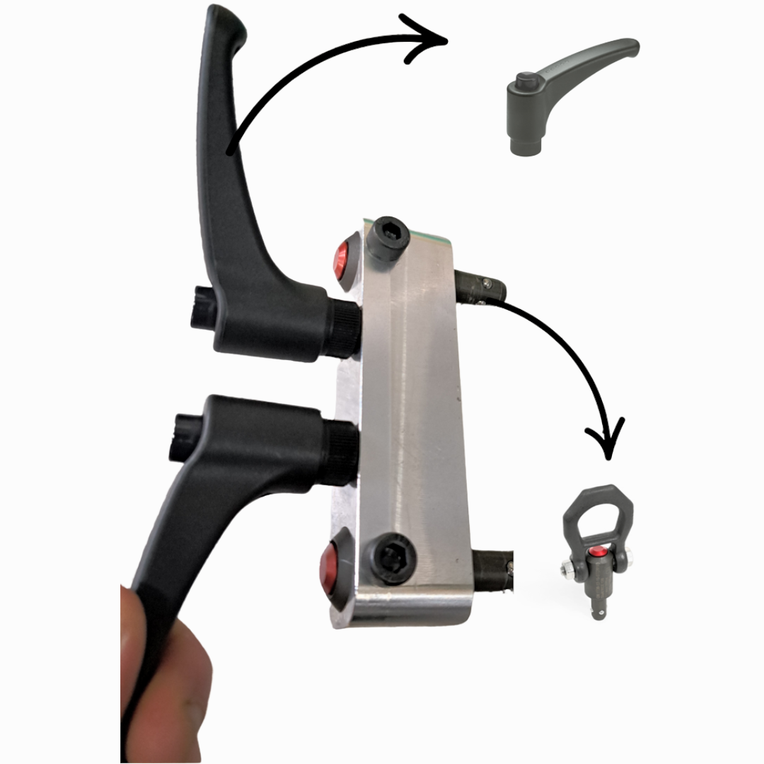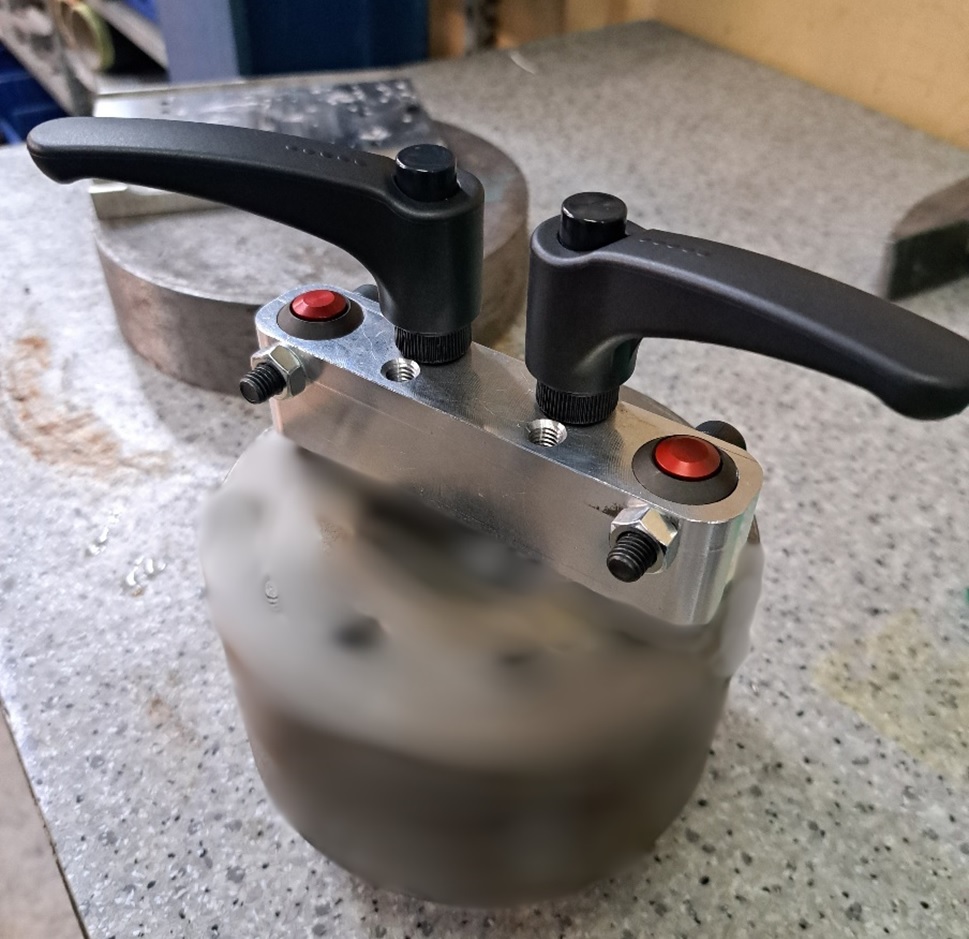 W przyrządzie do przezbrajania zostały użyte lekko zmodyfikowane trzpienie transportowe GN 1130, ponieważ zostało wymontowane z nich ucho transportowe. Trzpienie zostały zamontowane na stałe za pomocą śruby w specjalnie wyfrezowanej obudowie przyrządu. Ponadto zostały zastosowane rękojeści ERX z trzpieniem gwintowanym, które wkręcono w otwór gwintowany w wyfrezowanej obudowie. W tym przypadku rękojeści pełnią rolę uchwytu. Dzięki temu, że są to rękojeści nastawne, operator może ustawić je (w najbardziej optymalnej dla niego pozycji) podczas ustawiania głowicy w maszynie.