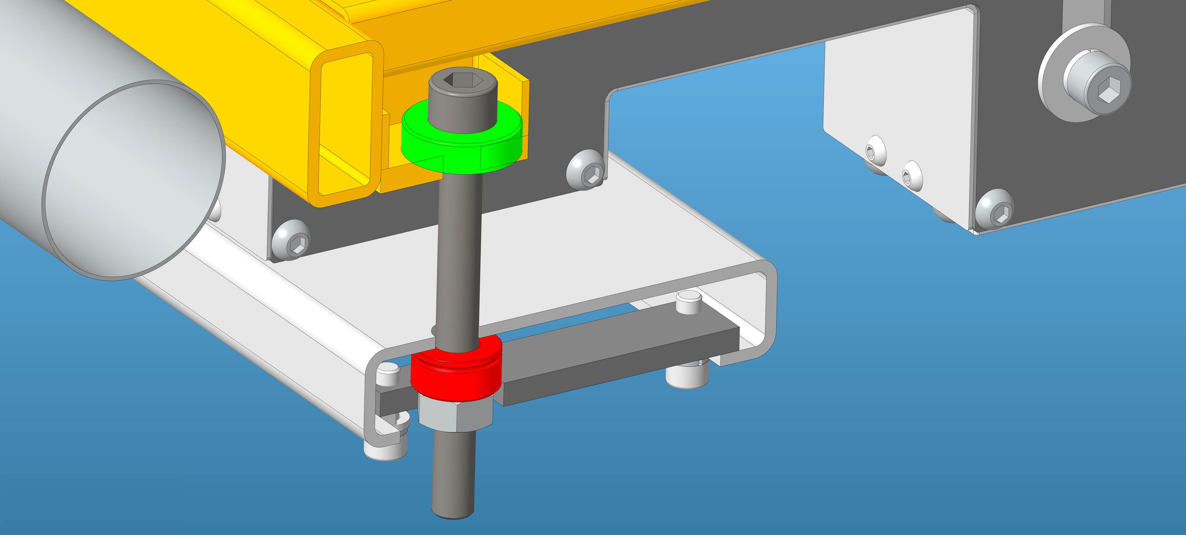 Długa śruba z łbem walcowym zapiera się o ramę (kolor żółty) poprzez podkładkę łożyskowaną GN 6342 (kolor zielony).