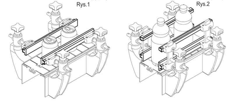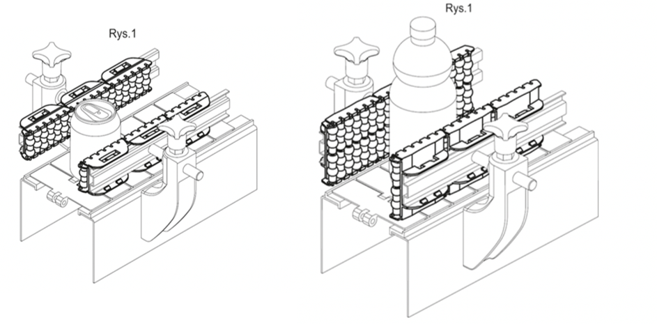 Oferowane wcześniej wsporniki i uchwyty band (Rys. 6) zostały dopełnione prowadnicami bocznymi, co obecnie stanowi kompletny system transportu i pozwala budować układy, od wsporników po same elementy prowadzące uwzględniające różne opakowania takie jak: puszki, butelki, kartony itp.