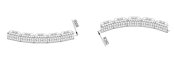 System łączenia przegubowych prowadnic bocznych umożliwia tworzenie promienia krzywizny zewnętrznej 500 mm oraz promienia krzywizny wewnętrznej 350 mm (Rys. 3).
