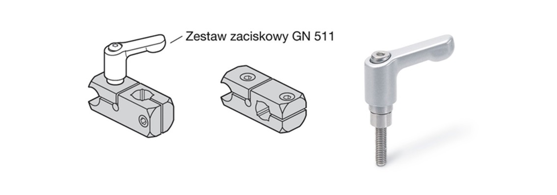 Nowe łączniki zostały wykonane z aluminium, a ich konstrukcja jest zaprojektowana pod kątem zachowania maksymalnej sztywności. Standardowo zacisk łączników odbywa się za pomocą nierdzewnej śruby z łbem walcowym i gniazdem sześciokątnym. Śruba może być zastąpiona zestawem zaciskowym GN 511, który umożliwia przezbrajanie układu bez użycia dodatkowych narzędzi, co znacząco skraca czas regulacji (rys. 4).