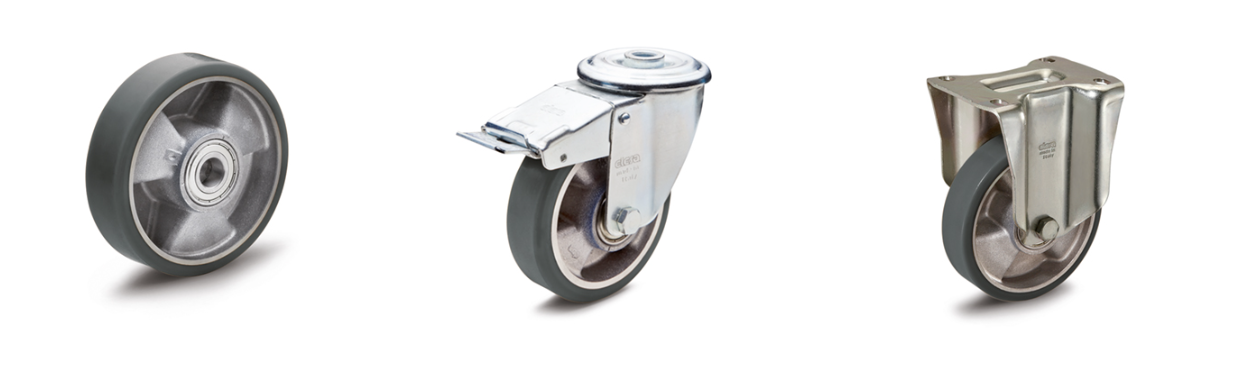 Przeznaczone do lżejszych aplikacji np. wózków gospodarczych lub wózków do transportu pojemników „Euro”, gdzie obciążenia dynamiczne nie przekraczają 3600 N na pojedynczy zestaw kołowy.