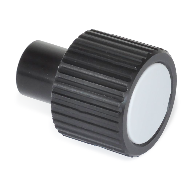 Pokrętło sterujące GN 957 w całości wykonane jest z aluminium. Powierzchnia jest anodowana na kolor czarny, co podnosi estetykę, a także zapewnia wysoką odporność na ścieranie oraz działanie czynników atmosferycznych i chemicznych. Zaślepka pokrętła wykonana jest z tworzywa sztucznego w kolorze szarym. Maskuje ona otwór mocujący, podkreślając estetykę całego elementu. Do blokowanie pokrętła na wałku używany jest wkręt DIN 916, wykonany ze stali nierdzewnej AISI 316.
