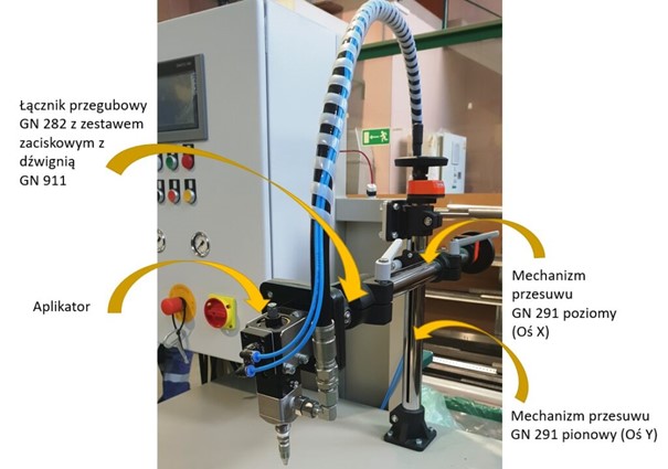 Zastosowane w projekcie mechanizmy przesuwu w połączeniu z odpowiednim zestawem dedykowanych łączników, tworzą układ XY. Odpowiednia konfiguracja pozwala operatorowi ustawić precyzyjnie wysokość, wysuw poziomy i kąt pod jakim będzie ustawiony aplikator (rys. 7).
