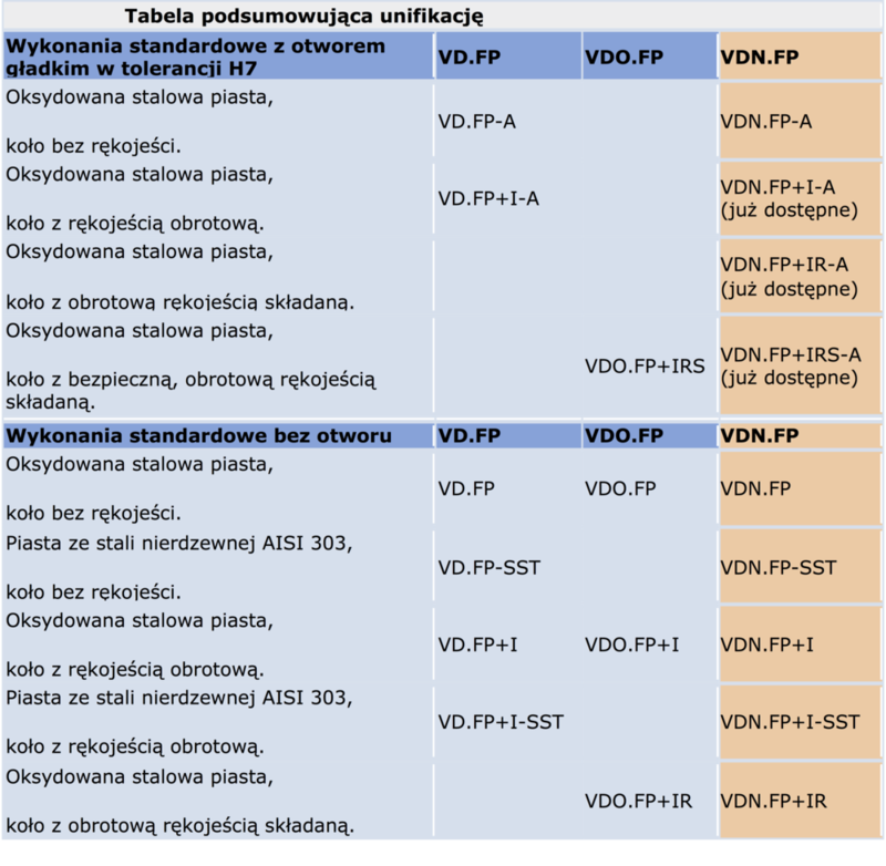 Dotychczasowe wersje kół serii VD.FP oraz VDO.FP będą dostępne do momentu wyczerpania zapasów i ich pełnego zastąpienia przez koła VDN.FP.