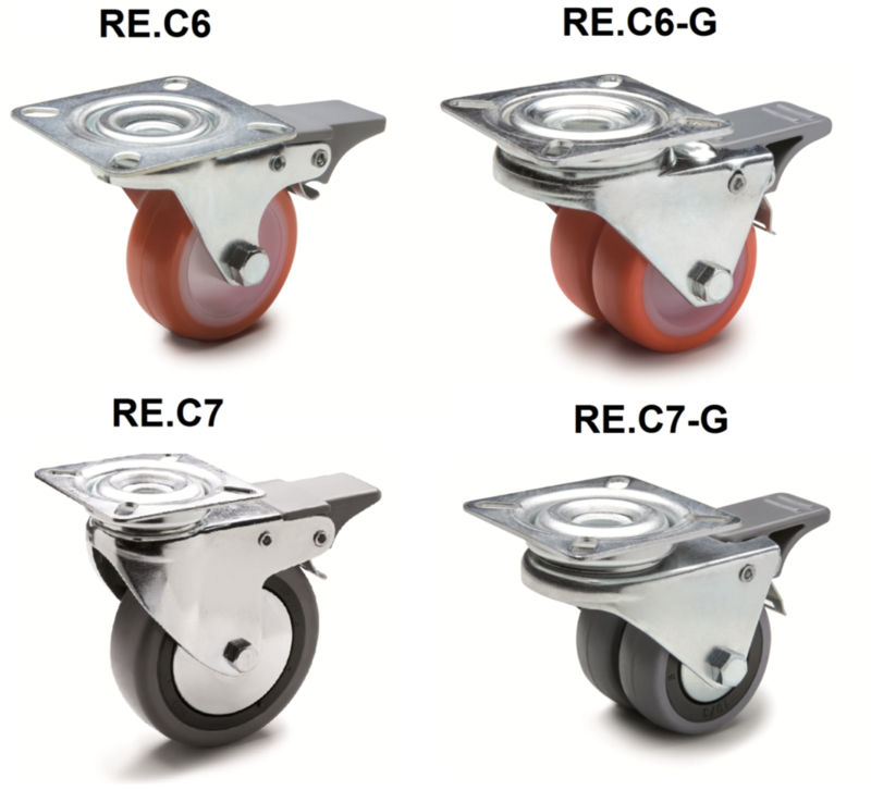 Obudowy zestawów RE.C6 wykonane są ze stali ocynkowanej. Posiadają kilka wariantów, w zależności od funkcji i sposobu mocowania (Rys.2). Charakterystyczną cechą zestawów kołowych RE.C6 jest zakres małych średnic wieńca koła, od 40mm do 60mm. Dzięki temu koła świetnie nadają się do małych i średnich zabudów, stosowanych w konstrukcjach i meblach medycznych, biurowych, warsztatowych oraz regałach sklepowych. Z kolei wysoka odporność na działanie czynników chemicznych, detergentów i wody sprawia, że koła mogą być używane w aplikacjach higienicznych, gdzie wymagane jest okresowe czyszczenie.
