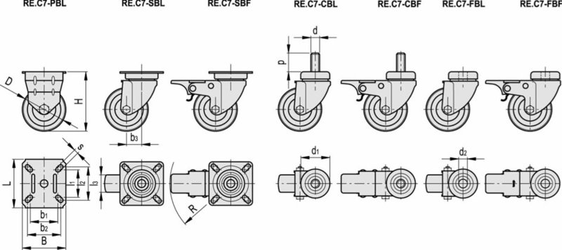 W przypadku zestawów kołowych serii RE.C7, najbardziej charakterystycznym elementem jest wieniec zewnętrzny. Jest on powleczony niebrudzącą i nierysującą, wulkanizowaną gumą w kolorze szarym. Podobnie jak modele RE.C6 koła tej serii posiadają obudowę ze stali ocynkowanej, która umożliwia różną instalację kół, w zależności od sposobu mocowania oraz od przeznaczenia (Rys.3). Docelowymi aplikacjami dla zestawów kołowych RE.C7 są najprostsze zastosowania ogólne, jak: stanowiska mobilne pod komputery i inna aparaturę, wózki biurowe, proste regały magazynowe, jak również ruchome stanowiska montażowe.