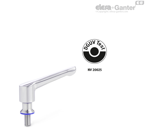 Dźwignie nastawne GN 305 z rękojeścią z litej stali nierdzewnej zostały sprawdzone zgodnie z wymogami DGUV, dzięki czemu są odpowiednie do użytku w obszarach o najwyższych wymaganiach dotyczących zachowania higieny.