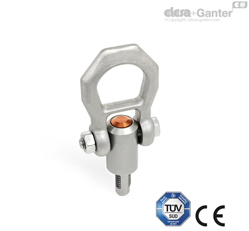 Gwintowane trzpienie transportowe GN 1133 to elementy nośne zaprojektowane do szybkiego i łatwego użycia. Wciśnięcie pomarańczowego przycisku powoduje odblokowanie części gwintowanych, umożliwiając wsunięcie lub wysunięcie trzpienia z gwintowanego otworu montażowego. Eliminuje to czasochłonny proces wkręcania i wykręcania stosowany przy prostych elementach do podnoszenia , takich jak np. śruby z uchem.