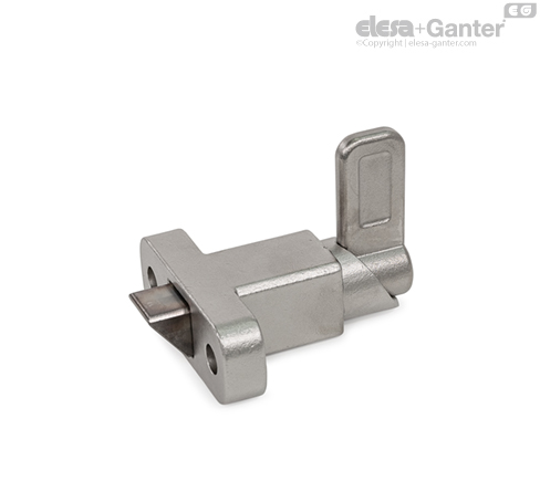 Trzpienie ryglujące GN 724.2 posiadają trzpień blokujący o kwadratowym przekroju poprzecznym, powierzchnię blokującą z jednej strony i ściętą z drugiej. Gdy przedmiot, który ma być zabezpieczony, napiera na ściętą powierzchnię, trzpień jest wpychany do korpusu. Po przejściu elementu przez korpus, trzpień wyskakuje, blokując ruch powrotny przedmiotu. Trzpień zatrzasku automatycznie zaczepia się na miejscu, gdy jest przesuwany w kierunku powierzchni zatrzasku. Blokadę można zwolnić poprzez odciągnięcie dźwigni.