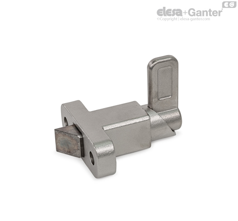 Trzpienie ryglujące GN 724.2 posiadają trzpień blokujący o kwadratowym przekroju poprzecznym, powierzchnię blokującą z jednej strony i ściętą z drugiej. Gdy przedmiot, który ma być zabezpieczony, napiera na ściętą powierzchnię, trzpień jest wpychany do korpusu. Po przejściu elementu przez korpus, trzpień wyskakuje, blokując ruch powrotny przedmiotu. Trzpień zatrzasku automatycznie zaczepia się na miejscu, gdy jest przesuwany w kierunku powierzchni zatrzasku. Blokadę można zwolnić poprzez odciągnięcie dźwigni.