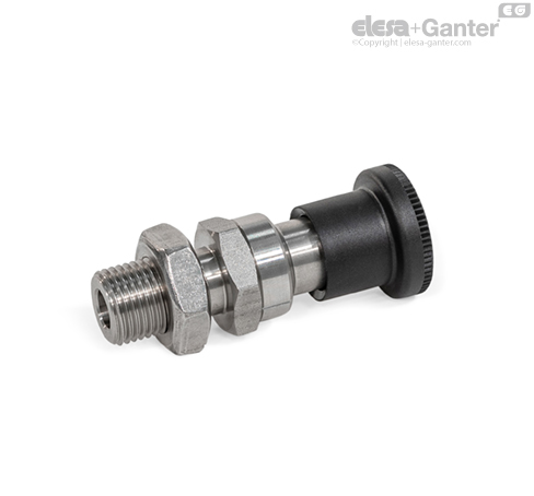 Trzpienie ustalające GN 824 posiadają trzpień blokujący o kwadratowym przekroju poprzecznym, powierzchnię blokującą z jednej strony i ściętą z drugiej. Gdy przedmiot, który ma być zabezpieczony, napiera na ściętą powierzchnię, trzpień jest wpychany do korpusu. Po przejściu elementu przez korpus, trzpień wyskakuje, blokując ruch powrotny przedmiotu. Trzpień zatrzasku automatycznie zaczepia się na miejscu, gdy jest przesuwany w kierunku powierzchni zatrzasku. Blokadę można zwolnić poprzez odciągnięcie gałki.