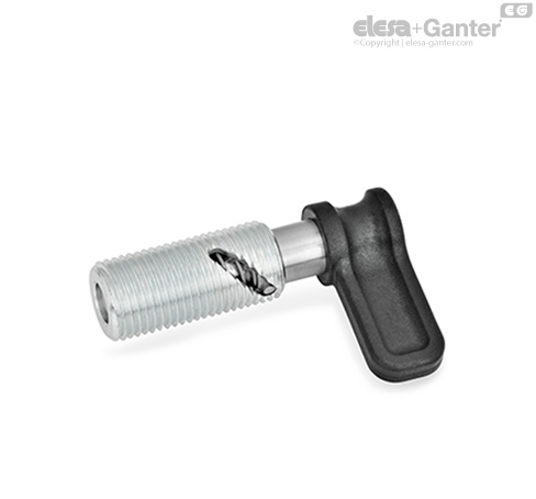 Trzpienie ustalające z dźwignią GN 712.1 są rekomendowane do zastosowań, w których trzpień ma się wysuwać sporadycznie. Obrót dźwigni o 90° lub 120° w lewo wymusza ruch kołka prowadzącego wzdłuż wyfrezowania, co w efekcie wywołuje osiowe przesunięcie trzpienia względem korpusu. Następnie trzpień zostaje wysunięty.