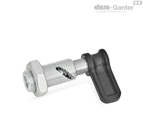 Trzpienie ustalające z dźwignią GN 712.1 są rekomendowane do zastosowań, w których trzpień ma się wysuwać sporadycznie. Obrót dźwigni o 90° lub 120° w lewo wymusza ruch kołka prowadzącego wzdłuż wyfrezowania, co w efekcie wywołuje osiowe przesunięcie trzpienia względem korpusu. Następnie trzpień zostaje wysunięty.