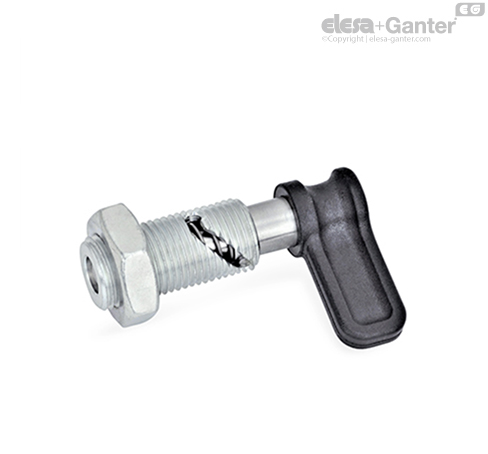 Trzpienie ustalające z dźwignią GN 712.1 są rekomendowane do zastosowań, w których trzpień ma się wysuwać sporadycznie. Obrót dźwigni o 90° lub 120° w lewo wymusza ruch kołka prowadzącego wzdłuż wyfrezowania, co w efekcie wywołuje osiowe przesunięcie trzpienia względem korpusu. Następnie trzpień zostaje wysunięty.