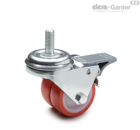 Mechanizm blokuje zarówno obrót koła, jak i obrót obudowy. Dźwignia blokady z technopolimeru.