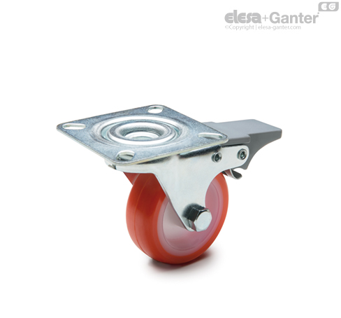 Mechanizm blokuje zarówno obrót koła, jak i obrót obudowy. Dźwignia blokady z technopolimeru.