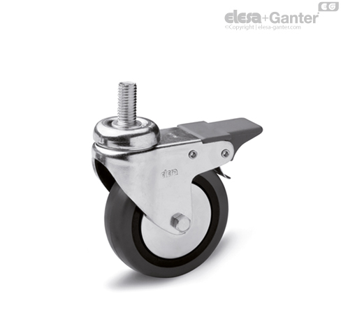 Mechanizm blokuje zarówno obrót koła, jak i obrót obudowy. Dźwignia blokady z technopolimeru.