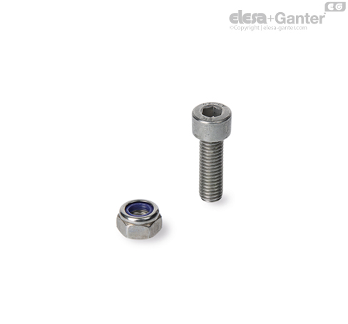 Śruba z łbem cylindrycznym i gniazdem sześciokątnym, zabezpieczona przed zatarciem i nakrętka samohamowna.