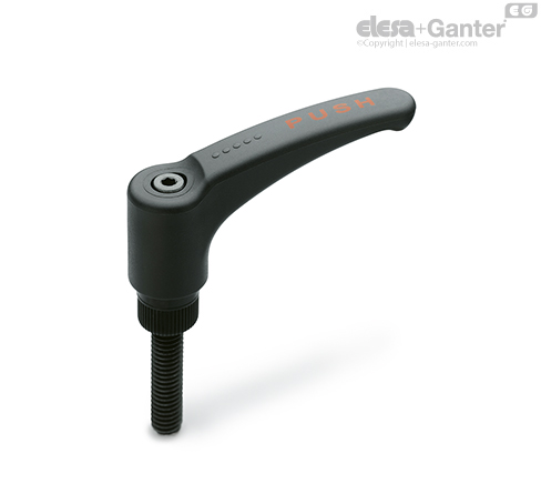 Element zaciskowy z wzmocnionego włóknami szklanymi technopolimeru, kolor czarny, z radełkowaną wystającą częścią ułatwiającą wstępne dokręcanie. Sprężyna powrotna ze stali nierdzewnej AISI 302.
