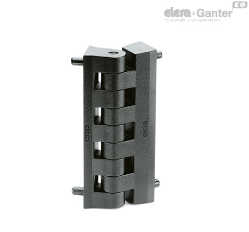 Otwory przelotowe pod wkręty M6 z łbami stożkowymi oraz dwie pary kołków pozycjonujących do dokładnego ustalenia korpusu zawiasów.